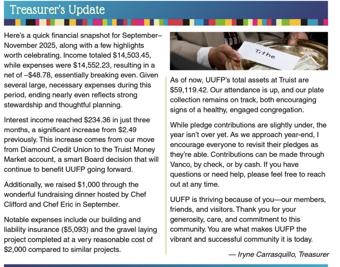 A big thank you goes out to each and every one of you for all that you do for UUFP and the many ways you contribute to our programs, services, technological upgrades, and